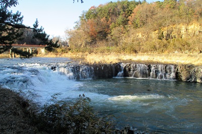 等窮宅跡(NTT)前の通りを南に向かい、南町郵便局がある大町交差点を左折。曲がってすぐ笠間稲荷の二又を右に進み、六軒道を直進。国道118号との交差点を右に曲がっていけば10分程で乙字が滝に出るが、ここは国道を横切って田中の渡し跡に向け直進。やがて男滝橋に出るので、ここを渡り、阿武隈川に沿って石河の滝を目指して遡る。