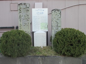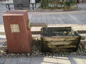 道路元標に並んで右側は山水道のモニュメントがある。江戸期初期の郡山宿の飲料水は、水田灌漑用溜池の水を各家に引いていたが、明和7年(1770)、商家達が高台に井戸を掘り、木管、竹管で屋敷内まで引く山水道を作った。付近の住人は、こうした商家から、貰い水をしていた。