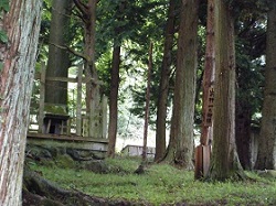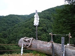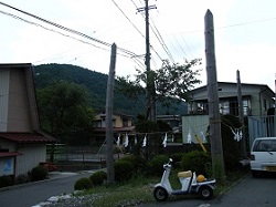 山裾の静かな道を10分ほど歩くと、またまた国道に合流するが、合流点の左側、坂の上が注連掛けと呼ばれる場所である。御柱に注連縄を掛けて清め、休ませる場所なのだそうだ。