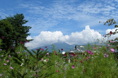 ここから先は、浅間山噴火の跡を残す追分原といわれる。浅間山とそれに連なる山々がどこからでも見られ、コスモスなどの花々が咲くのどかで開放感がある街道は、歩いていてすこぶる心地がよい。