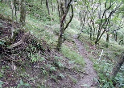 一里塚跡の先はガレ場になり「是より崖道 足元注意」の標識がある。片足くらいの幅しかない道で、崖地には丸太の桟(かけはし)が架けられている。左側は崖になっており、石がゴロゴロしていて、標識どおり注意しないとちょっと危険。
