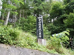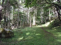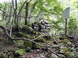 森の中の峠道を下ると石小屋跡がある。厳冬期の通行には人馬供に難渋を極めたという。そこで下原村の名主勝五郎は郡奉行に願い出てここに石積の避難小屋と荷置場を築いたという。