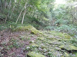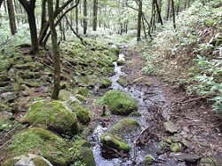 接待茶屋からまた山道に入って行くが、途中にも避難小屋がある。その小屋を過ぎると、苔むした大きめの石がごろごろしている坂に変わってくる。