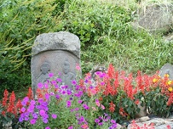 路傍に建つ様々な石仏のひとつである道祖神は、集落と集落との境界や道の分岐に建つ路傍の神である。芭蕉の「奥の細道」では旅に誘う神様として冒頭に登場する。その道祖神も地方によっていろいろあるが、男女一対の双体道祖神は、ここ信濃路の安曇野を中心に多く見られる。ところどころで見かけるが、そのたび、なんとなく心が和む。