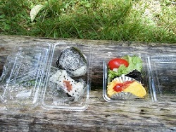 ベンチで、昨日の宿で用意してもらったお弁当を広げる。おにぎりだけと思っていたら、おかずやデザートなどが少しずつだがいろいろ詰まっていて、山歩きのことを熟知したオーナ夫婦の細やかな気遣いが伝わり、感謝感激。