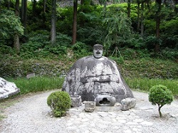 春宮境内から左手奥に入り、浮島神社横を通って浮島橋を渡った畑の奥に、万治の石仏が鎮座している。岡本太郎が激賞したというこの石仏は、大きな自然石の上に首がちょこんと乗っているユニークな石仏として人気があり、訪れる人も多い。