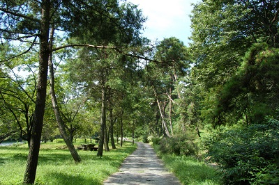 やがて正面に緑の広場が広がる西餅屋に至る。
