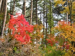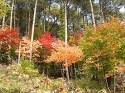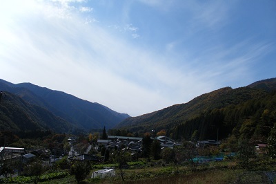 しばらく広く開けた畑のようなところが続く。その背景の山々はきれいに色づき、青い空と白い雲は、画のように美しい。