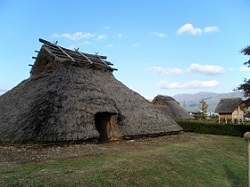 一里塚の先左手、畑の奥のほうに、復元された竪穴住居が何棟も見える。ここ平出遺跡は縄文時代から平安時代にかけての大集落跡で、今も整備が続けられている。