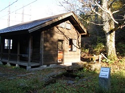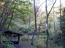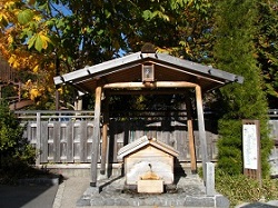 木々がきれいに色づいた頂上から下っていくと、柿沢茶屋本陣がある。塩尻峠の両側に設けられた茶屋本陣のうち、諏訪側が今井茶屋本陣で、塩尻側がこの柿沢本陣である。茶屋の向かい側には明治天皇塩尻嶺御膳水の石碑と古井戸がある。