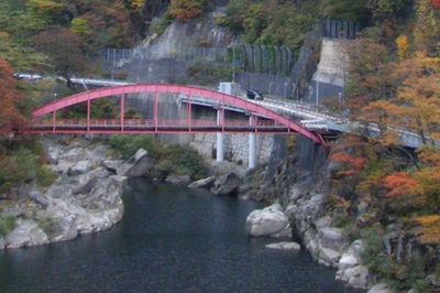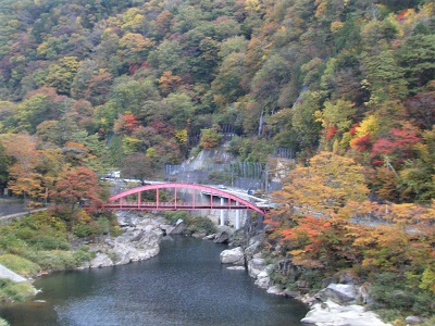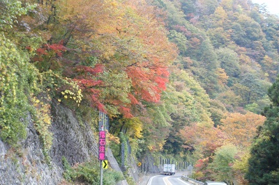 歩道の無い国道を、怖い思いをしながら歩いていくと、やがて木曽ノ桟の案内標識と赤い橋が見えてくる。通行の危険性とは裏腹に、この辺りの木曽川の渓谷と紅葉は実に素晴らしく、車をかわしながらカメラのシャッターを切るのに忙しくなる。