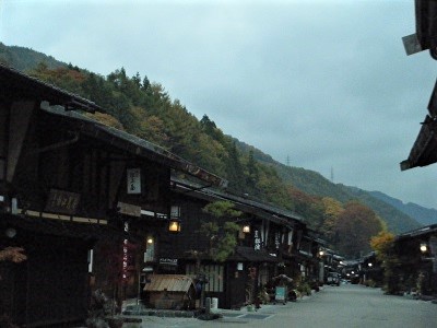 釣瓶落としの秋の日、奈良井に着いたのは、すでに夕暮れ時。昼間の賑やかさはとうになくなり、人影もまばらで、少し寂しさ漂う感じとなっている。