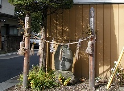 魁塚から少し行くと御柱に囲まれた道祖神がある。下諏訪周辺ではところどころに見られる光景である。