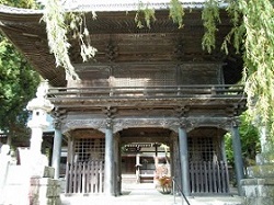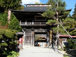 柿沢集落を過ぎて塩尻入口の手前に来ると、大きな茅葺の建物が見えてくる。永福寺は木曾義仲が信仰した馬頭観音を本尊として創建され、茅葺の観音堂は安政年間に再建されたもの。仁王門は堂々としたつくりで、観音堂とともに市指定有形文化財となっている。
