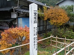 すぐに宿場外れで、道はゆるい坂道を下る。途中左手に立派なナマコ壁の土蔵があり、その先に宮ノ越の一里塚の木柱がポツンと立っている。