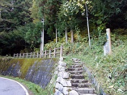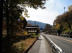 上り始めは元来た方向に少し戻るが、すぐ先でスイッチバックの如くぐるっと向きを変え、国道に沿って崖の中腹にわずかに張り付いたような形でつけられた道を桜沢茶屋本陣の方に向かっていく。まさに島崎藤村「夜明け前」の出だしの「あるところは岨(そば)づたいに行く崖の道、・・・」の表現そのままである。