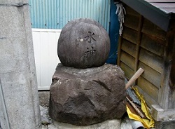 深沢住宅の少し先、右手の路地入口に「贄川のトチ」の小さな案内標識があり、そちらに入って行くとちょっと分かりにくい枡形になっていて、片隅にボール状の石を重ねた水神碑が置かれている。このような水神碑はちょっと珍しい。