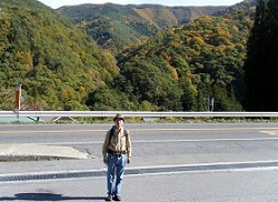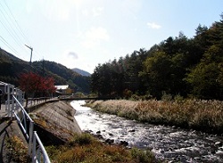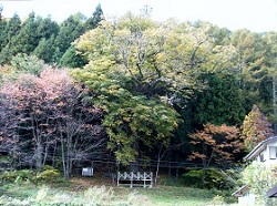 寺の前を山のほうに向かう道を少し登った崖のところに、三脚にカメラをセットしてシャッターチャンスを狙っている様子の若者二人を見かける。近づいていって、何を狙っているのか尋ねると、遥か遠くの山あいにほんのわずかに見えている古い鉄橋を列車が通過する瞬間を狙っているんだと言う。よりによってこんなところで、と思うようなところで、一瞬のシャッターチャンスを狙う鉄道マニアの拘りと執念に脱帽。