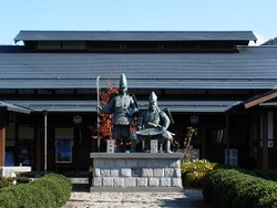 宮ノ越の駅を出て木曽川にかかる義仲橋を渡ると、その先右側に義仲に関する資料をおさめた義仲館がある。門をくぐると正面に、凛々しいいでたちの巴御前と義仲が並んだ像が建っている。