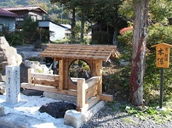 少し先の民家の脇に邂逅(あうた)の清水入口の標識がでている。木曽義仲の馬の足を今井兼平がここで洗ったのが、洗馬宿の名前の由来となったといわれている。民家の庭先をかすめて階段を下りていくと、木製の流しに太田の清水が流れている。