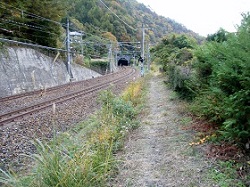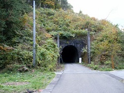 坂を上りきると中平立場跡の小さな集落に入り、その先の国道19号の陸橋下を通っていくと、明治43年に開通したという旧中央線トンネルが見えてくる。このトンネルが結構長くて、おまけに途中から曲がっているようで出口が見えない。照明は一応ついているはずだが、節電のせいか、殆ど真っ暗で何も見えず、思わず急ぎ足で抜け出る。