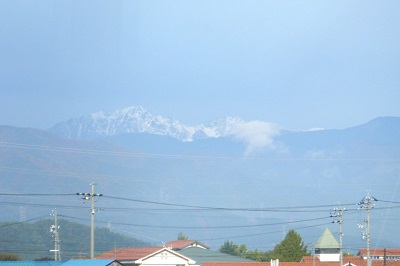 二日目も、朝から青空が広がり、ひんやりした空気が実にすがすがしい。駅前で挨拶を交わした人が、駅向こうに穂高が見えるよ、と教えてくれた。駅の階段を登って反対側に行ってみると、確かに遠くに雪をかぶった穂高連峰が見えている。