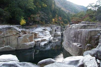 寝覚ノ床は、花崗岩の柱状節理でできた奇岩がそそり立つところに木曽川の清流が流れ込む景勝地である。巨大な花崗岩の白と川面のエメラルドグリーンが絶妙な色彩を醸し出していて、なかなか珍しい景観が見られた。