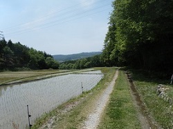乱れ坂を下ると小さな集落に入り、茶屋跡などをすぎて田圃のあぜ道ほどの細い草道を進む。