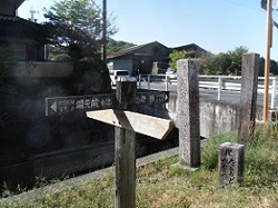 右に曲がって加納大橋を渡ると、その先の枡形道の道標のところで左に曲がっていく。次の枡形道手前に東番所跡碑が建てられている。街道はここを左に曲がり、すぐに右へ曲がって県道を横断していく。突き当たりに道標があるが、ここは左に曲がる枡形道。橋を渡ると高札場跡の説明板が建てられている。当時は宿御高札場と呼ばれていたそうだ。