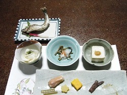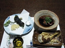 早速、ひと風呂浴びて一息入れたら、ほどなく夕食となる。この夕食が、予想外に素晴らしいものだった。正直言って、片田舎の料理程度のものを想像していたが、美濃焼きの器を使い、地元の山の幸・川の幸をふんだんに使い、品数も多く、出来立ての料理が次々に運ばれてくる。