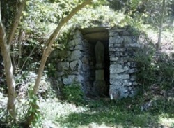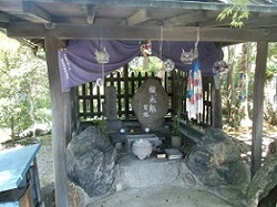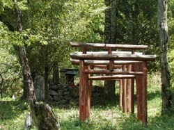 巡礼水の先からびあいと坂を下ると、ちょっとした広場に出る。ここは阿波屋の茶屋跡といわれる場所で、広場端の石窟に十三峠の三十三観音が祀られている。道中の旅人の安全を祈って、大湫宿の馬持ち連中と助郷村などの寄進で建立されたのだそうだ。