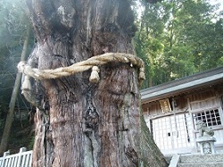 脇本陣の先にある神明神社は慶長年間(1596~1614)に創建されたということだが、すごいのは「神明の杉」。樹齢1300年、幹回りは10mとも11mとも云われるもので、近くで見るとたしかに巨木である。