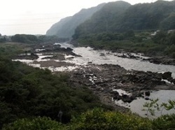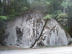 大洞の馬頭様のすぐ先に安藤広重の版画にも描かれている大湫の二つ岩がある。写真は母衣岩(ほろいわ)と呼ばれている大岩。