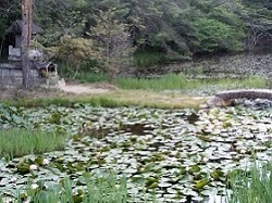 やや遠回りをしてしまったが、やがて旧道に戻ると少し先に弁財天の池がある。池にはハスの花が咲いていて、ここまで歩いてきたところの山間の景色とはちょっと異なった雰囲気になる。