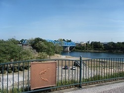 難所であった太田の渡しに替わる太田橋を渡って、国道に突き当たる手前で、ヘアピンカーブのように木曽川沿いの土手の所に出来た遊歩道を進んでいく。左のほうに今来たばかりの太田橋が見え、その下の化石林公園のところが嘗ての太田の渡し跡だったところになる。