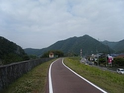 駅から木曽川のほうに向かうと、国道と並行して、日本ラインを眺めながら歩く堤防上の道、ロマンチック街道が続いている。