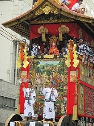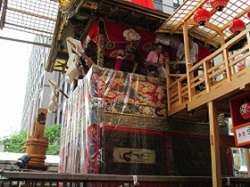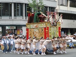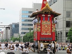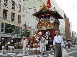 翌7/17はいよいよ祇園祭のハイライトの山鉾巡行の見物である。約束の時間より早めの8:30ころ、待ち合わせの場所に行くと、すでにIさんも来ている。見物のベストポジションを確保しようという気遣いが有難い。京都市役所前の交差点での辻回しが目の前で見られる位置だ。二時間ほど待って漸く山鉾がやってきた。すぐ目の前を鉾の車がギシギシと音を立てながら通り、ちょっと先で辻回しが行われる様は流石に圧巻である。先頭の長刀鉾をはじめ一つ一つが特徴のある芸術品でもある32基の鉾を目の前でたっぷり楽しむことができた。