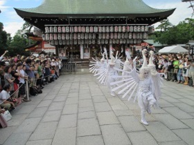 再会後、まずはにしんそばの老舗松葉で軽く腹ごしらえし、八坂神社境内で行われる鷺舞奉納を見物。