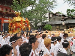 西楼門石段下で三社神輿の差し上げが行われ、この後、3基の神輿はそれぞれの氏子の地域を練り歩き、四条御旅所に向かう。
