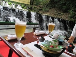 貴船神社を参拝し、いよいよ川床での食事だ。貴船川床は、手を伸ばせば届きそうなくらい川面に近く、真夏でも暑さを忘れさせられるような清々しい空気が漂う。京都盆地特有の蒸し暑さも忘れ、都会の喧騒からも離れ、青々とした木々の中をそよぐ風、鴨川の源流貴船川のせせらぎを聞きながらいただく京料理は格別、という触れ込みに違わず、本当に満足のいく趣向であり、その中でいただく京懐石は格別であった。