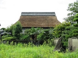 神社の角から右手の旧道へ入って行く。旧道は茅葺き屋根の家なども見られる人通りのない静かな道で、周囲ははるか遠くまで田圃が広がっている。
