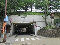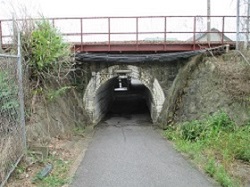 アーケードを抜けた先のトンネルが旧草津川隧道で、上は天井川である旧草津川である。この川は天井川であるが故に浸水被害を繰り返したため、昭和46年に新草津川に付け替えが行われ、旧草津川は廃川となった。下の写真は、トンネルを出た所が草津側からトンネルを振り返り見ているもの。一年前に東海道を歩いて来た時にも見た景色だ。