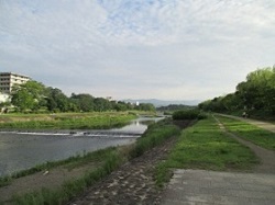 宿の前の丸太町通りを西に行って鴨川に出たところで、川添いの散歩道を北に向かい、下賀茂神社へ。参道の入り口あたりの駐輪場に自転車を止め、そこから長い参道を歩いて早朝の下賀茂神社を参拝する。