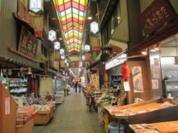 朝食後、かねてから一度は行ってみたいと思っていた錦市場に自転車で向かう。市役所前の駐輪場に自転車を置いて、そこからは歩いていく。本能寺前を通って寺町通りを南に下り、錦天満宮のところで右に入ったところが市場の入り口になっている。