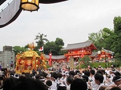 美術館から高台寺横を通って八坂神社に向かう。南楼門にたどり着くと神輿渡御に向けた段取りが賑やかな中にも粛々と進められている様子がすぐ目の前で繰り広げられる。神輿渡御に先立って本殿で祭典が行われ、3基の神輿は、順に南楼門を出て神輿渡御のメインイベント会場の八坂神社の西楼門前に参集する。3基目の神輿の後ろについていくと、西楼門前はすでに人だかりが一杯で身動きできないほどになっている。