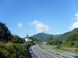 土の山道が続き、再び開けると中央自動車道の談合坂SAが眼下に見える。