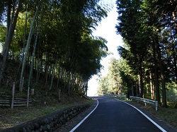 立てかけられている甲州街道ぶらり旅の看板に従い、ここは寺の右手を回り込むように右の道を行く。寺の裏手の竹林の中の道を進むと高速の歩道橋に出て、ここを渡ると林の中の道になる。