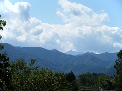 宿場の外れは枡形になっており、寶勝寺前を通ってアスファルト道が山の中へ入って行く。この先はどんどん山の中に入って行き、見えるのは彼方の山並みばかりになる。