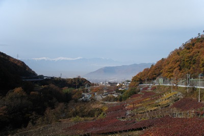 洞門を抜けて共和地区(横吹)にくると、西の方角にはなにもさえぎるものがなく、視界がパァッと開ける。前方の山腹にはブドウ畑が続き、その奥には勝沼の町がひろがり、さらに遠くに南アルプスの峰々が横たわる雄大なパノラマが広がる。