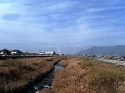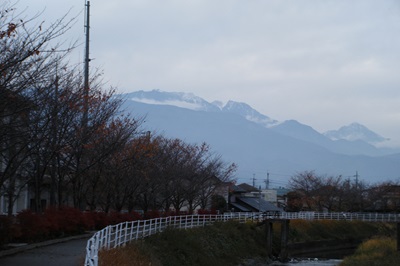 美術館通りを歩いているとほぼ正面に鳳凰三山が迫ってくる。ただし、折角の景色なのに、電信柱と電線が邪魔くさくてしょうがない。そのため、街道から少し北側の日川沿いの道を行くことにした。こちらは遊歩道として整備されていて、電信柱や電線のような邪魔なものはなく、車も通らないため、実にのどかで快適なルートである。この道は竜王まで通じており、本日は竜王まで行ったところで帰途に就くこととする。